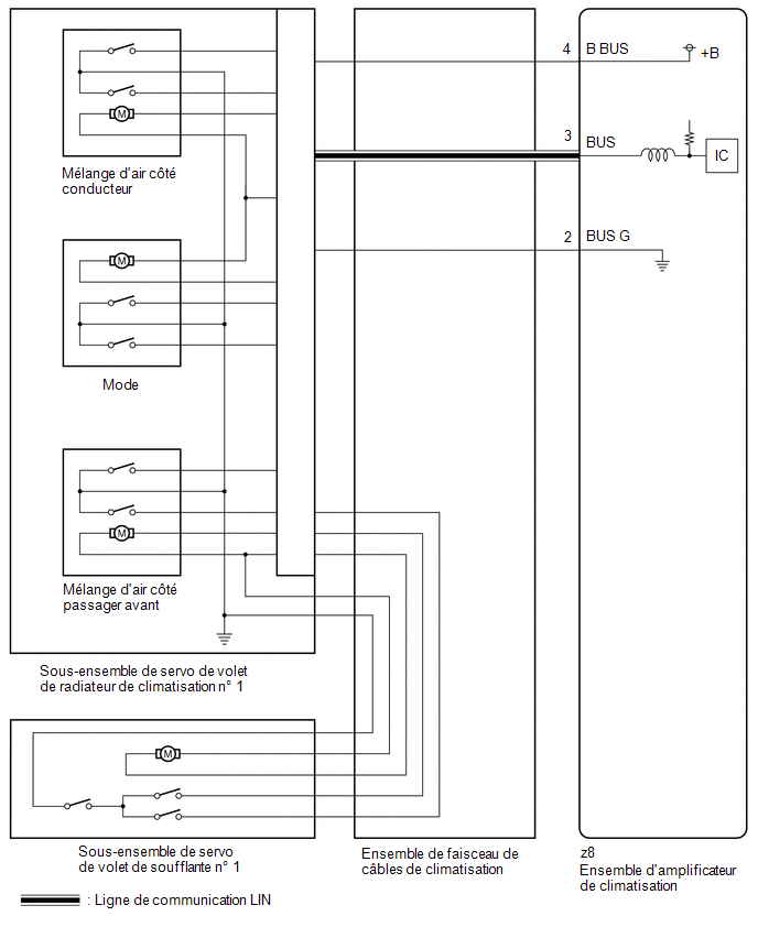 L'ensemble d'amplificateur de climatisation communique avec le servo via un IC de communication/pilote et un ensemble de câblage nommé ensemble de faisceau de câbles de climatisation.
