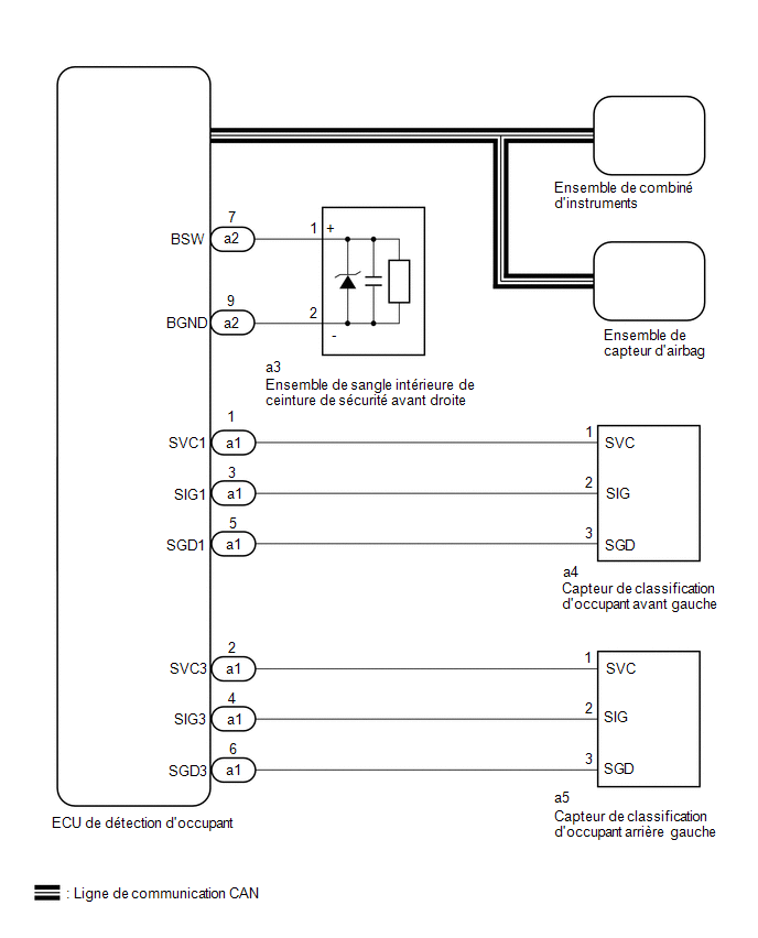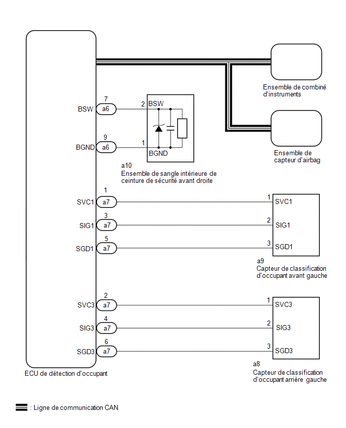 Le système de rappel de ceinture de sécurité utilise le système de communication CAN. Tout d'abord, s'assurer qu'il n'y a pas de dysfonctionnements dans le système de communication CAN. Se reporter à la section Comment utiliser la recherche des pannes.